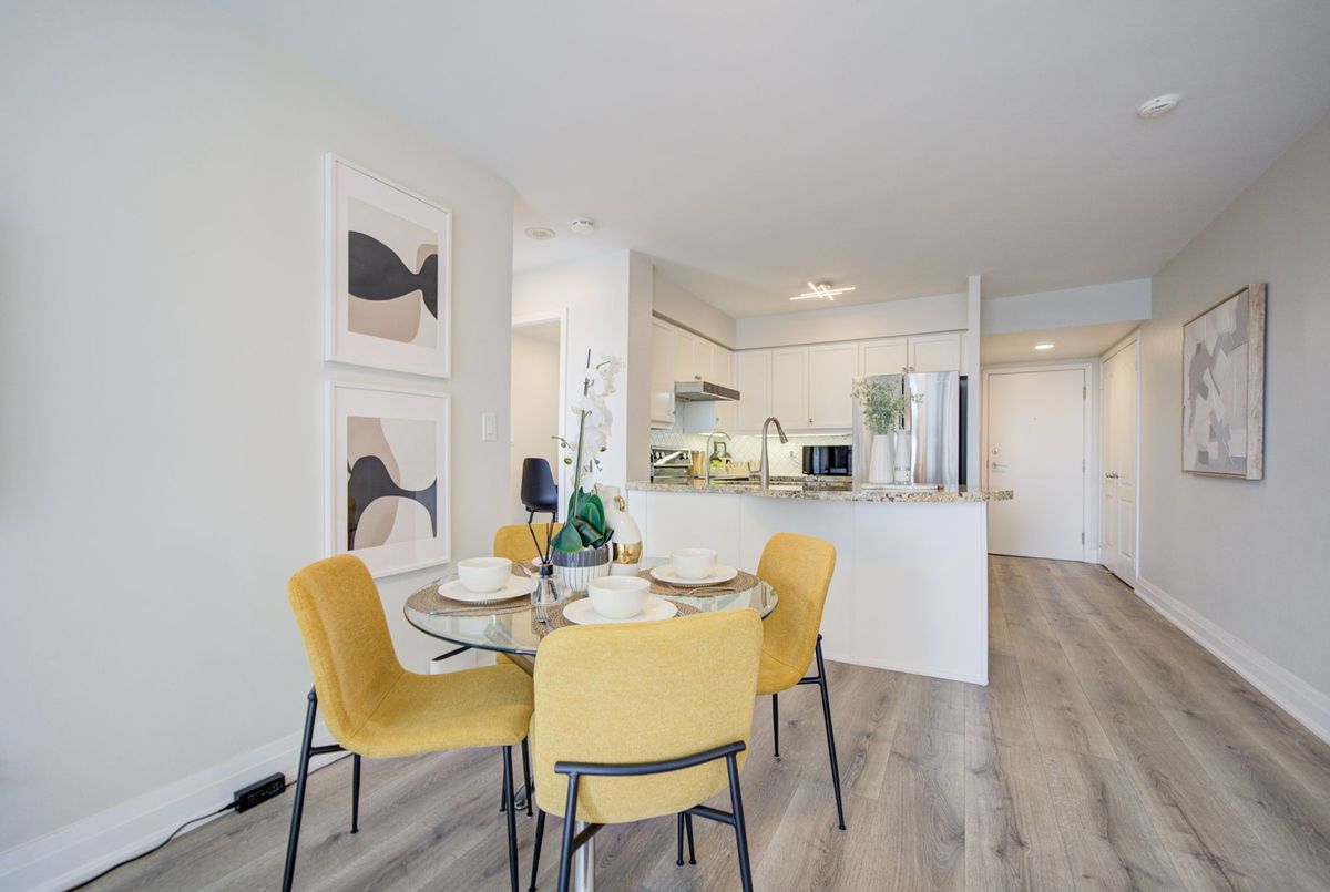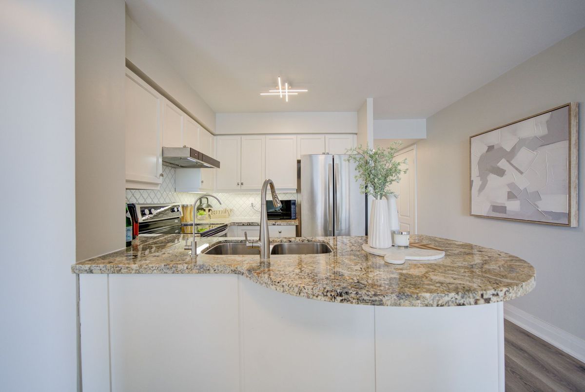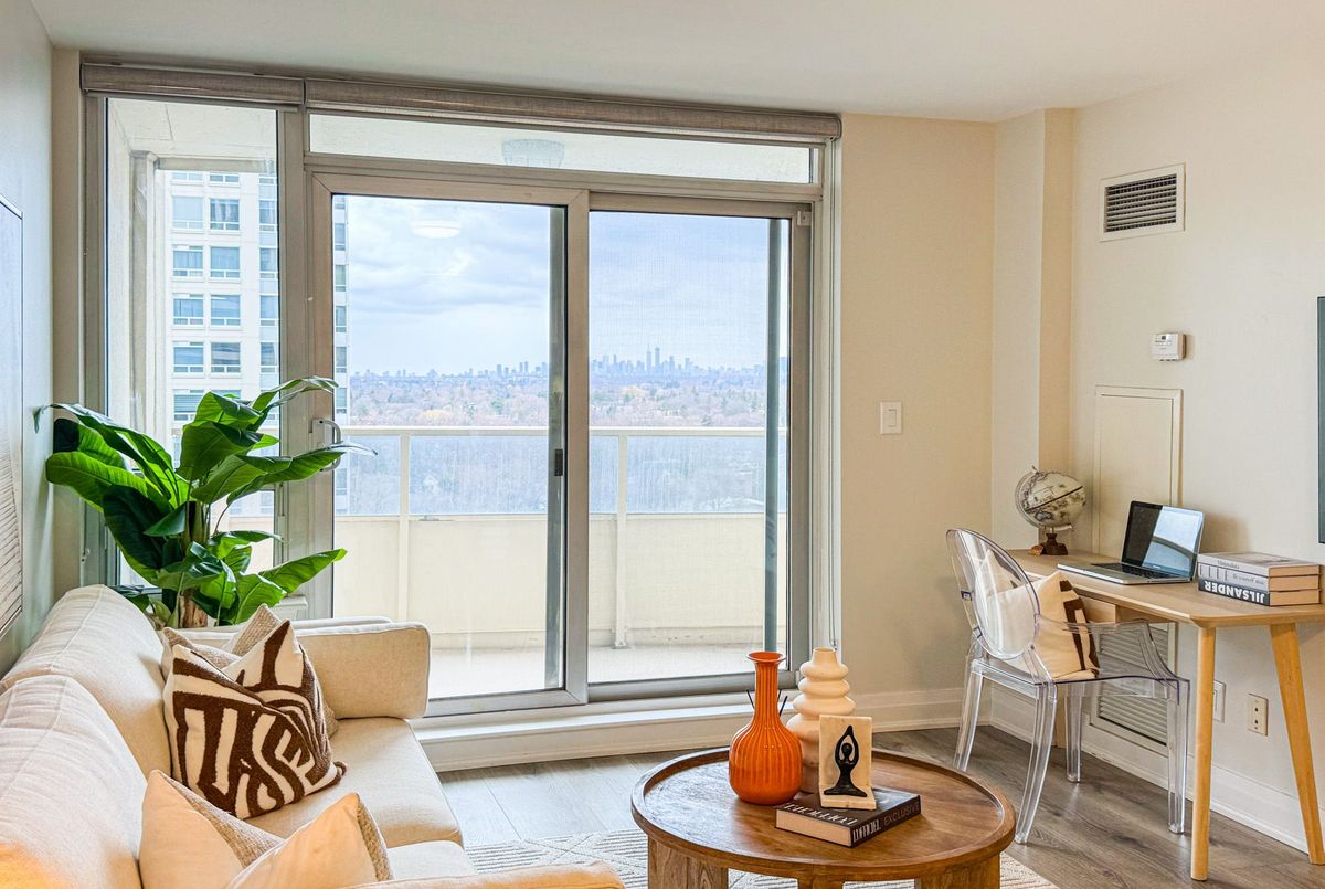 Bright, high-floor south-facing condo with stunning CN Tower views in the heart of Bayview Village. This fully renovated 1-bedroom offers a functional open layout with a dedicated work-from-home space - perfect for today's lifestyle. Enjoy unobstructed city views from both the living room and bedroom, filling the space with natural light throughout the day. Thoughtfully upgraded with smooth ceilings, pot lights, new laminate flooring, and modern finishes.The stylish kitchen features marble countertops, a center island ideal for dining or entertaining, and upgraded Samsung stainless steel appliances including range hood, washer, and dryer. A 3-in-1 water softener and filtration system adds everyday comfort and convenience. The spa-inspired bathroom has been fully renovated with clean, modern finishes, creating a move-in-ready living experience..Includes 1 parking and 1 locker. Steps to Bayview Village, subway, parks, and quick access to Hwy 401.A perfect opportunity for first-time buyers or investors seeking a turnkey unit with views, functionality, and location.